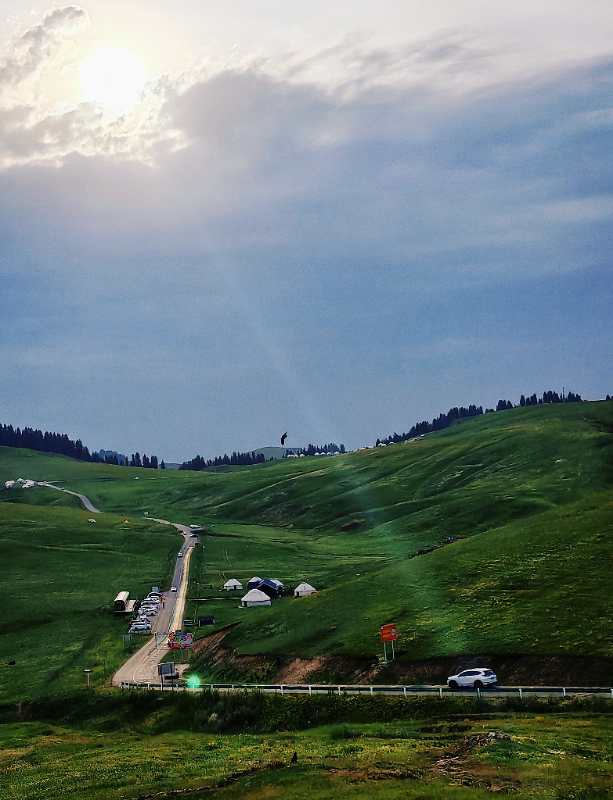 新疆木垒哈萨克自治县点点毡房、绵延山路与茵茵草原相映成趣(2023年7月20日摄)。新华社记者 熊聪茹 摄