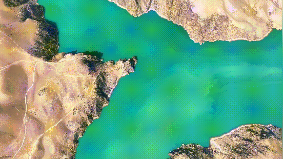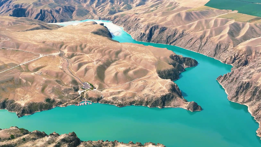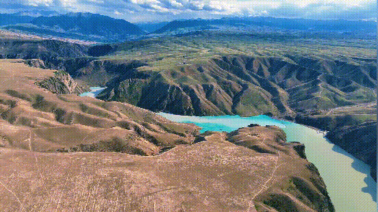 湖水似翡翠般碧绿、在阳光的照射下湖面仿佛铺上一层抹茶奶盖,蜿蜒曲折延伸至远方。从空中俯瞰,犹如镶嵌在戈壁深处的一颗璀璨明珠。