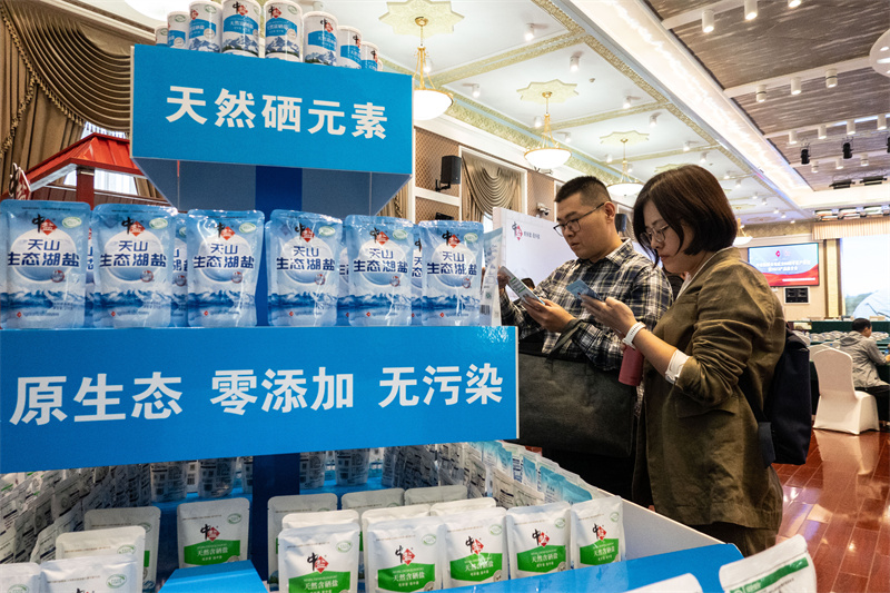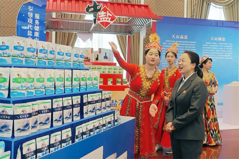 9月8日,工作人员向参会人员介绍中盐新疆公司生产的天山岩盐、天山湖盐和天山雪晶盐。张珏 摄