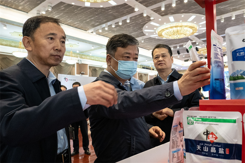 9月8日,中盐集团公司党委书记、董事长李耀强(中)在会前观摩中盐新疆公司的盐产品。