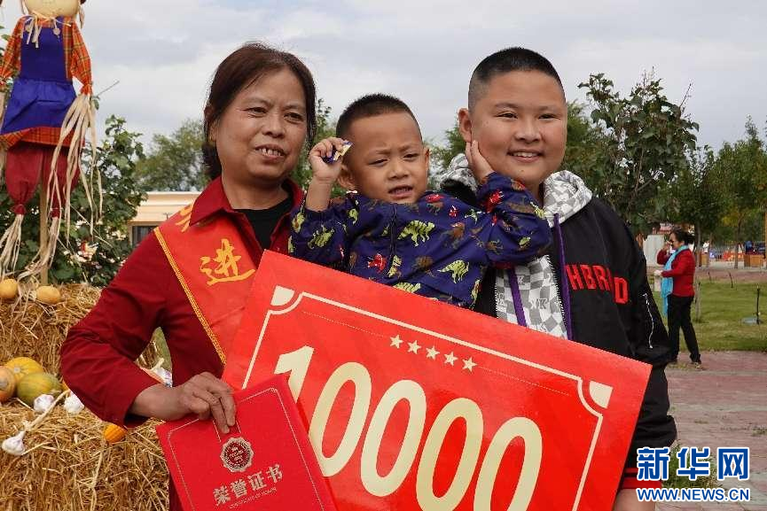 单产比武竞赛“小麦类”第一名的王银花与家人分享喜悦。新华网发 张珏 摄