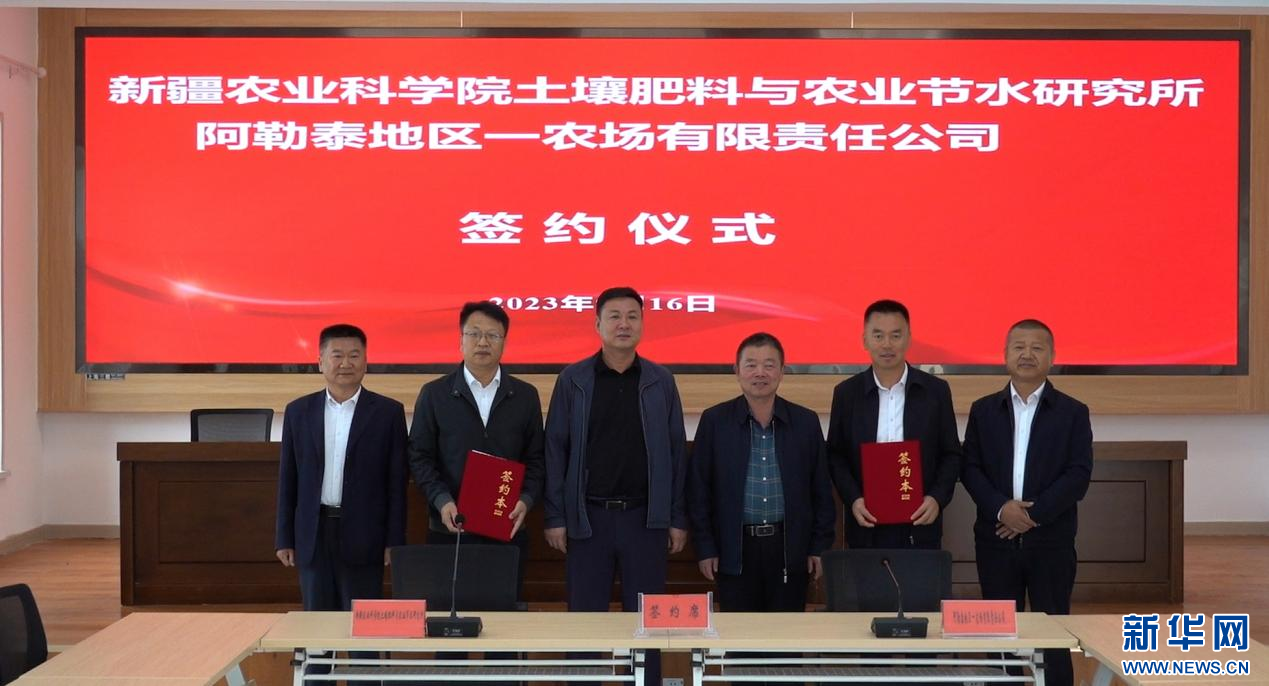 新疆农业科学院与阿勒泰地区一农场签约。新华网发 张珏 摄