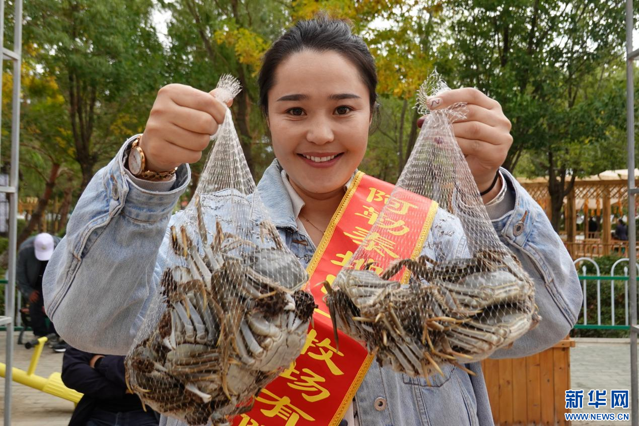 参展企业展示养殖新鲜螃蟹。新华网发 张珏 摄