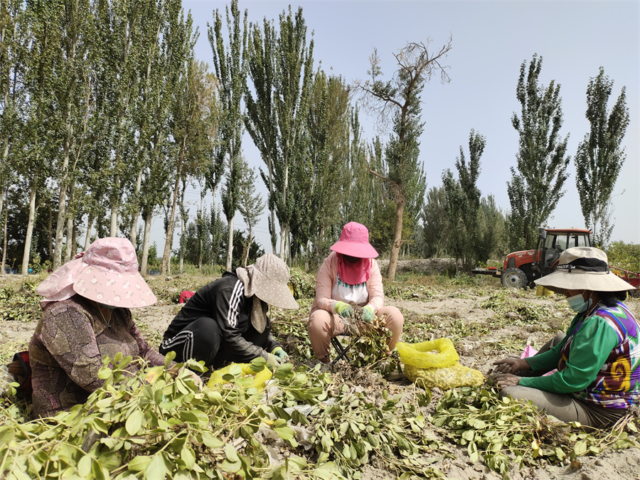 “我主要负责拔草和摘花生,现在我们村里的花生成熟了,我利用农闲时间来到这个地方摘花生,每天能挣70块钱。”疏附县布拉克苏乡伊肯其英其开村村民阿依夏穆古丽·热依穆说。