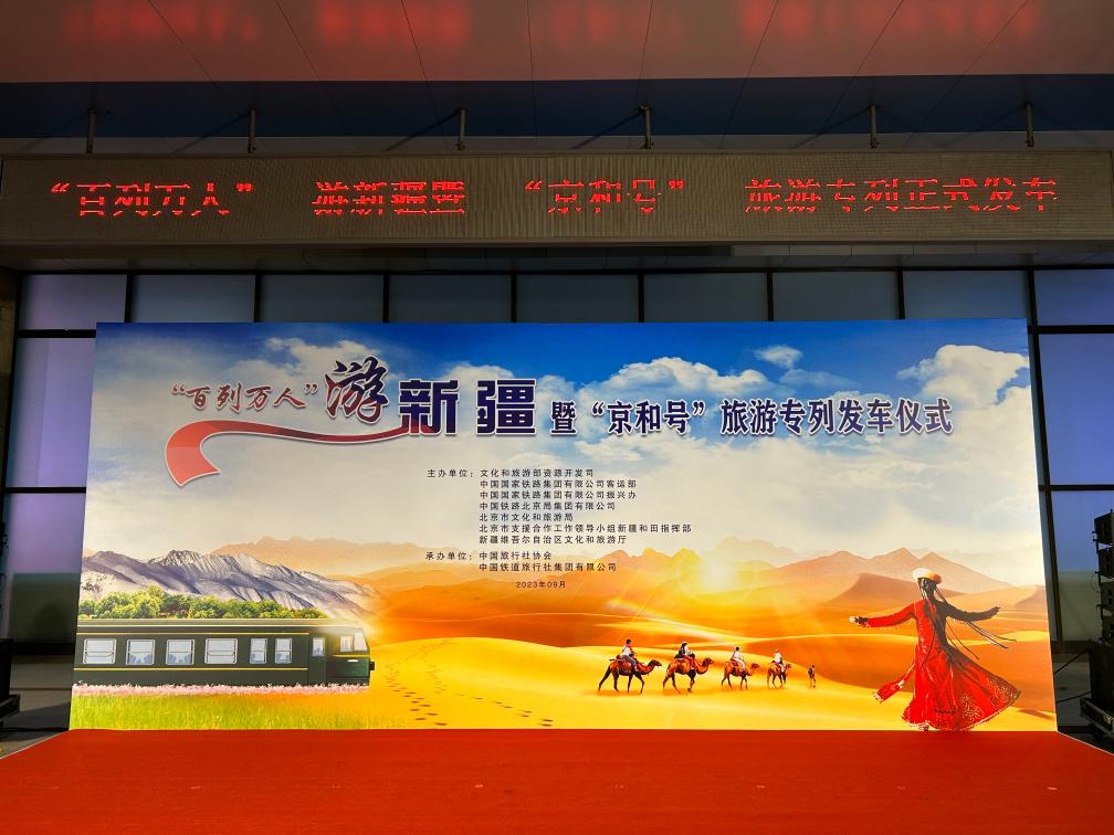为加大新疆旅游开放力度,鼓励支持国内外游客到新疆旅游,文化和旅游部资源开发司、国铁集团客运部、新疆维吾尔自治区文化和旅游厅等9月24日在京举行“百列万人”游新疆暨“京和号”旅游专列发车仪式。当日下午,Y465次“京和号”旅游专列载着500余名游客从北京西站出发。