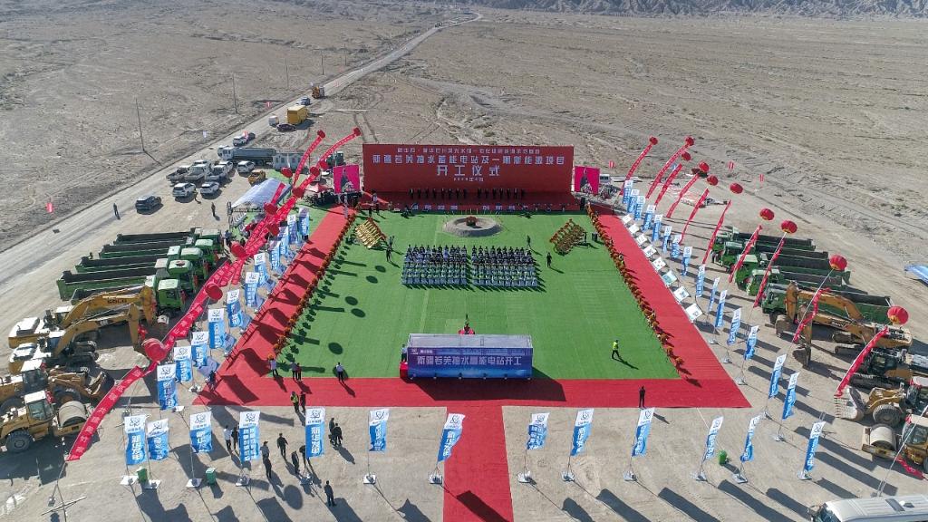 这是9月25日无人机拍摄的新疆若羌抽水蓄能电站项目开工仪式现场。(新华若羌抽水蓄能发电有限公司供图)