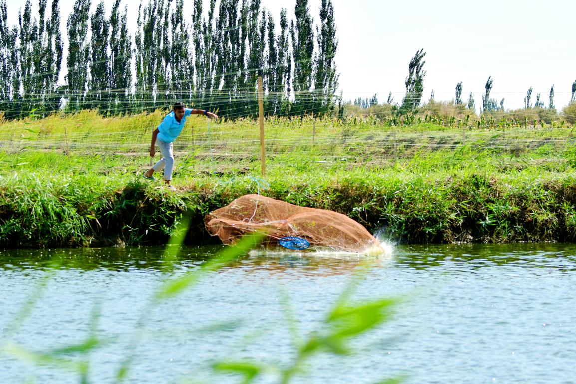 在七团玛滩镇九连,养殖户彭珍的鱼塘以前是无人问津的盐碱芦苇滩、排碱渠。2021年,在连队党支部的支持下,她筹集资金承包了这片荒滩,引来活水稀释盐碱水,养殖鲢、鲫、草鱼等淡水鱼,经过几年的努力,鱼塘变成了“聚宝盆”。