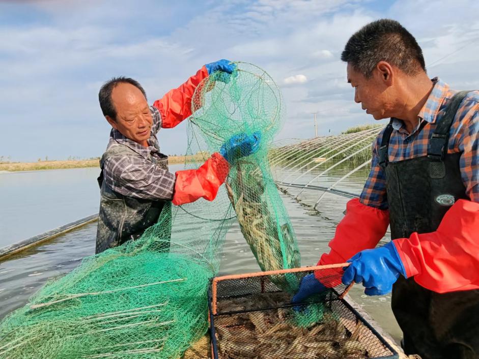 乌苏市四棵树镇水产养殖技术人员正在打捞南美白对虾。(李道忠 摄)