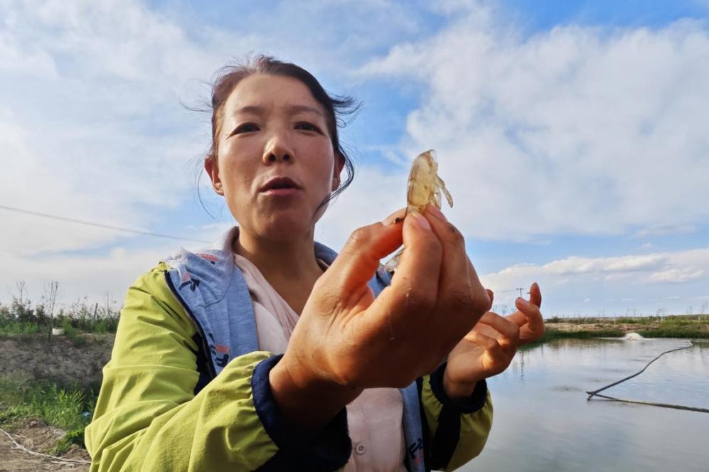 9月23日下午,乌苏市四棵树镇水产养殖技术员许薇凌,从刚打捞的一网南美白对虾中拿起一尾近似手掌长的活虾,熟练的掰虾头褪虾皮去虾线,然后将一整粒半透明虾肉放进嘴里。