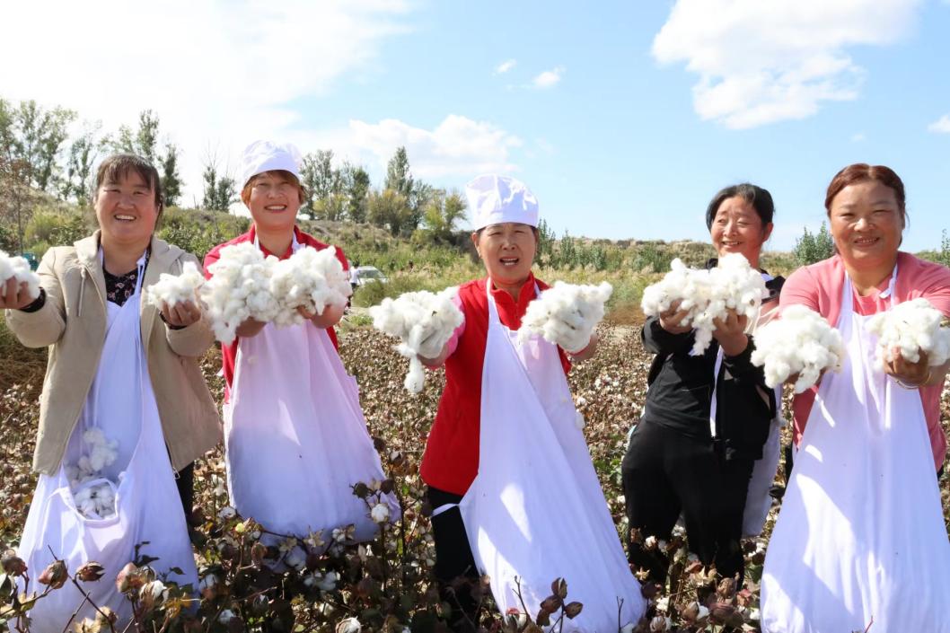 乡亲们在采棉花比赛中展示“战利品”。(乌苏市委宣传部提供)