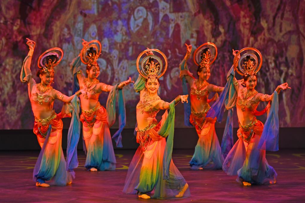 在舞蹈《龟兹乐舞》中,克孜尔石窟的壁画图案营造出美轮美奂的舞台场景,舞蹈演员跷足、摆胯、合掌、拈花……舞蹈轻盈、歌声婉转,遗存在史料、壁画上的龟兹乐舞仿佛“活”了起来。