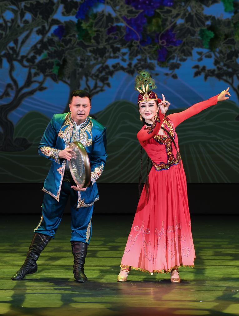 “掀起了你的盖头来,让我来看看你的眉……”演出在《掀起你的盖头来》的优美歌声和动人旋律中拉开帷幕。演出分为“舞从天山来”“歌飞新丝路”“交响昆仑情”三个篇章,通过绚丽多彩的舞台设计,展现了新疆各民族之间交往交流交融的生动景象;通过精美绝伦的艺术呈现,展示了开放、发展、幸福的美丽新疆。