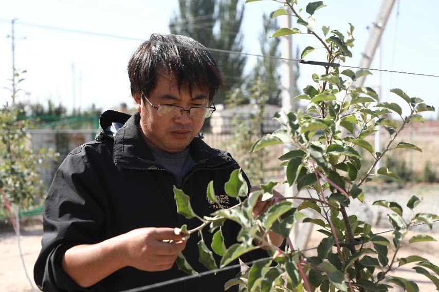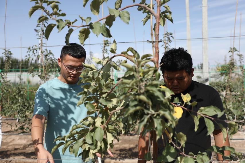 马厚泽与五团沙河镇农发中心工作人员查看果树长势。张大松 摄