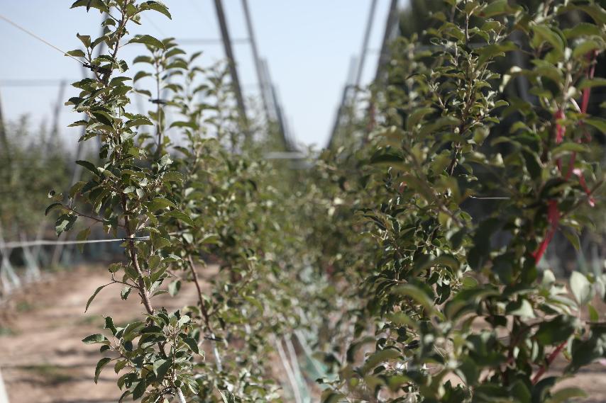 V型架高标准矮砧密植苹果示范园里引进的新品种果树苗。张大松摄)