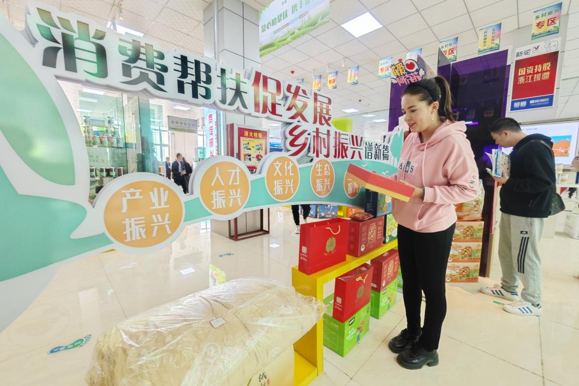 工作人员在乡村振兴馆展示阿克苏农副产品。(张珏 摄)