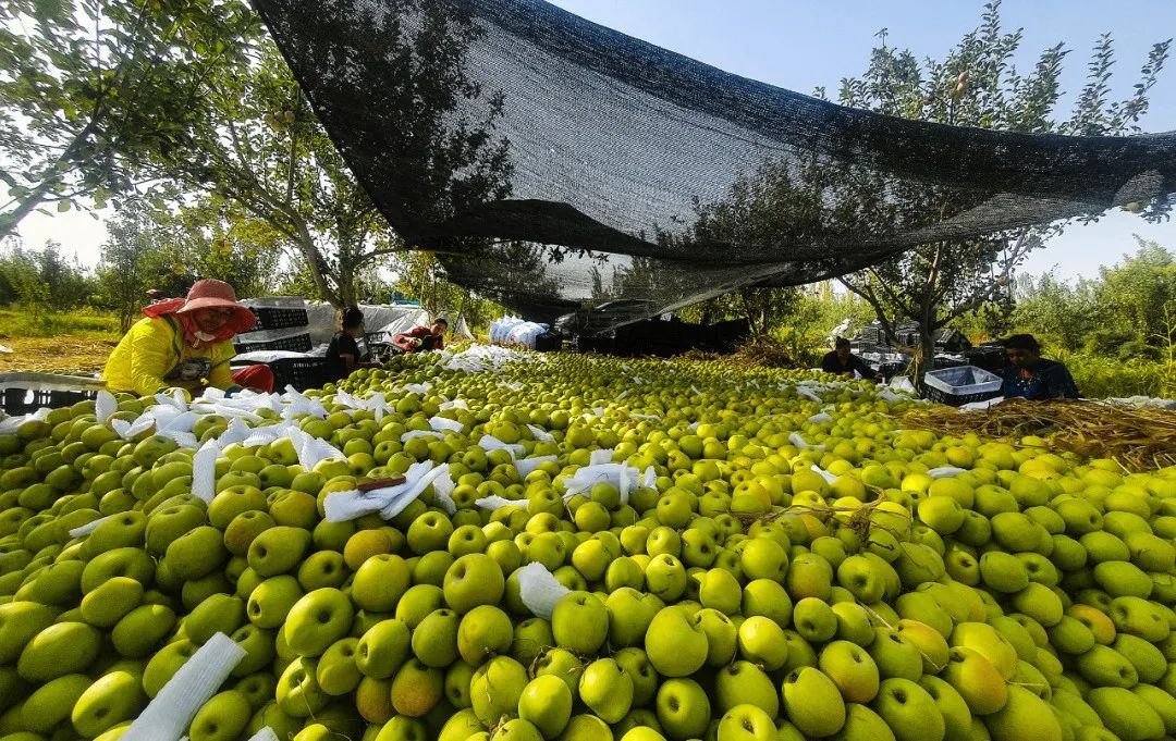 果农们正忙着采摘、分拣、包装