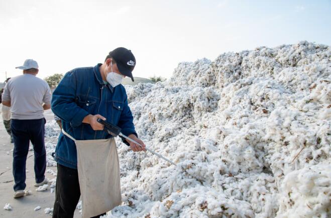 10月9日,在位于阿合其农场的博州华棉五台轧花厂,一垛垛棉山堆积而起,等待加工。工作人员正按照规范流程对棉花进行抽样检查、检测衣分、过磅称重等工序。同时,进行检验登记和系统录入,做好闭环管理工作。