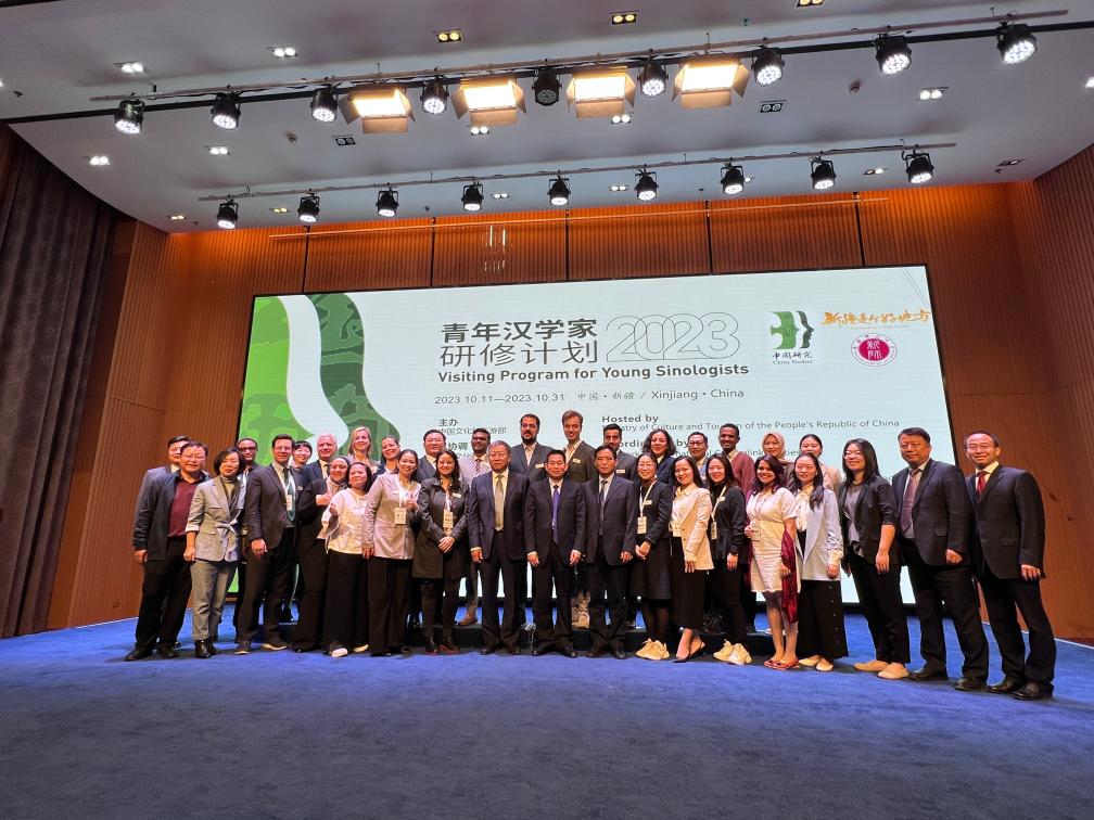 2023青年汉学家研修计划新疆班开班仪式现场,参会人员集体合照。 新华社记者 周晔 摄