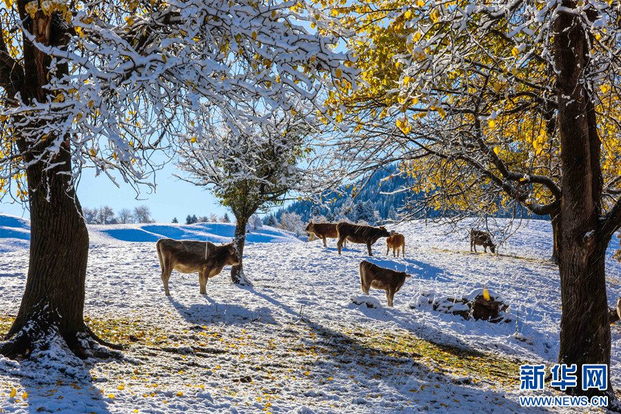 金秋与飞雪共舞,独属于秋日的壮丽奇观就此拉开序幕。近日,一场秋雪与那拉提大草原上的五彩金秋相遇。白雪倾覆那拉提大草原,仿佛为这个美丽的草原披上了一层洁白的轻纱。