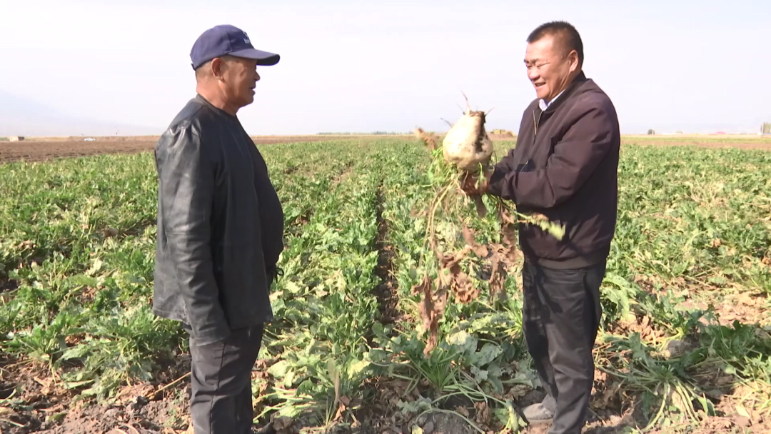眼下,精河县阿合其农场的甜菜喜获丰收,长势喜人,各村队积极组织种植户利用大型收获机械和拉运车辆采收、运输、销售甜菜。