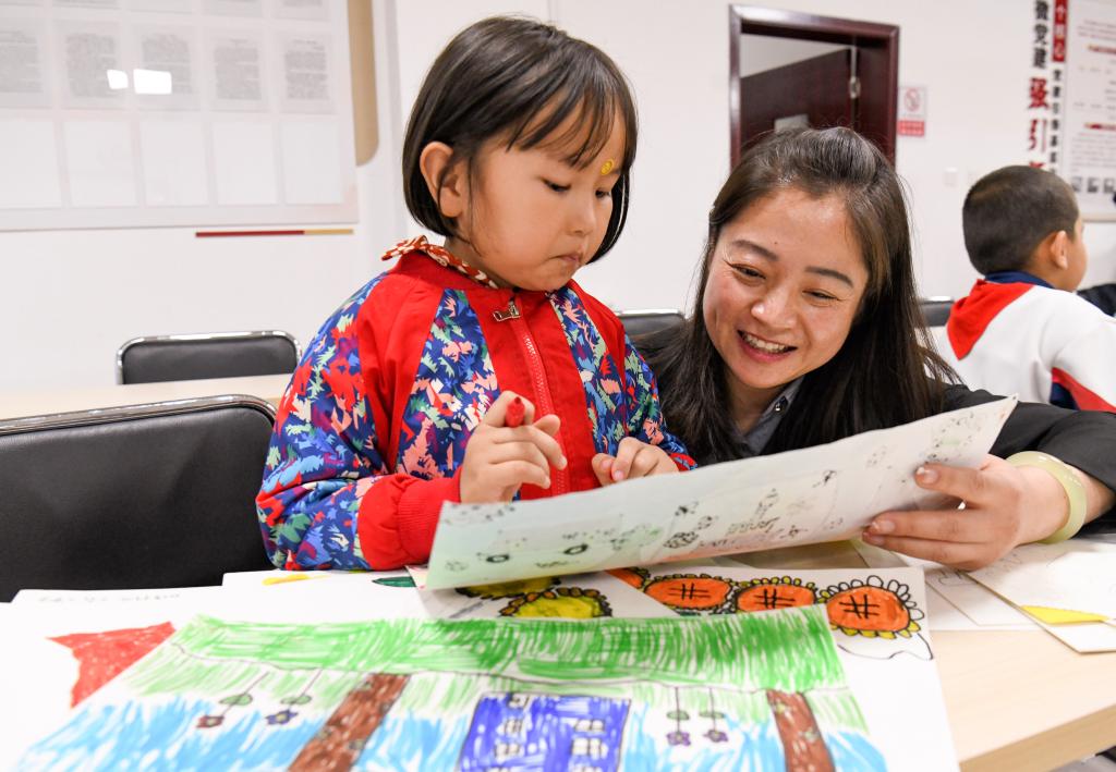 在新疆生产建设兵团第十二师西山农牧场安康社区的会议室内,社区党总支书记、妇联主席马丽辅导参加“六点半课堂”兴趣班的小朋友绘制美术作品(10月10日摄)。
