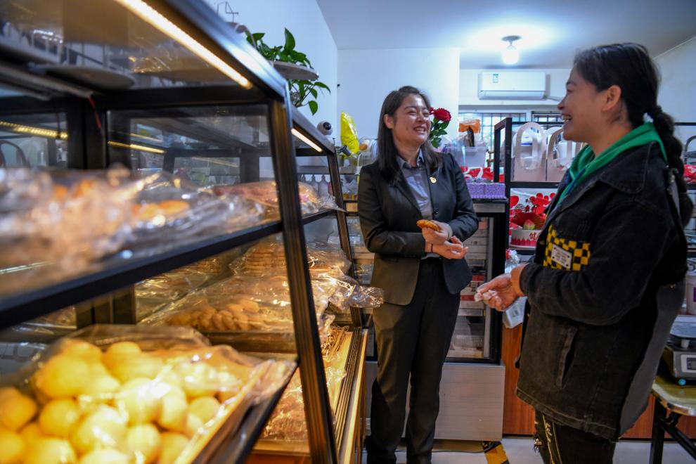 新疆生产建设兵团第十二师西山农牧场安康社区党总支书记、妇联主席马丽(左)在居民开办的甜品店中走访(10月10日摄)。新华社记者 王菲 摄