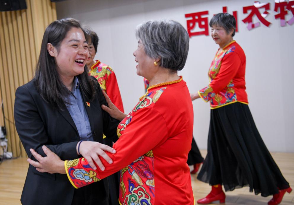 在新疆生产建设兵团第十二师西山农牧场安康社区的会议室内,社区党总支书记、妇联主席马丽(左)与排练舞蹈的居民交流(10月10日摄)。