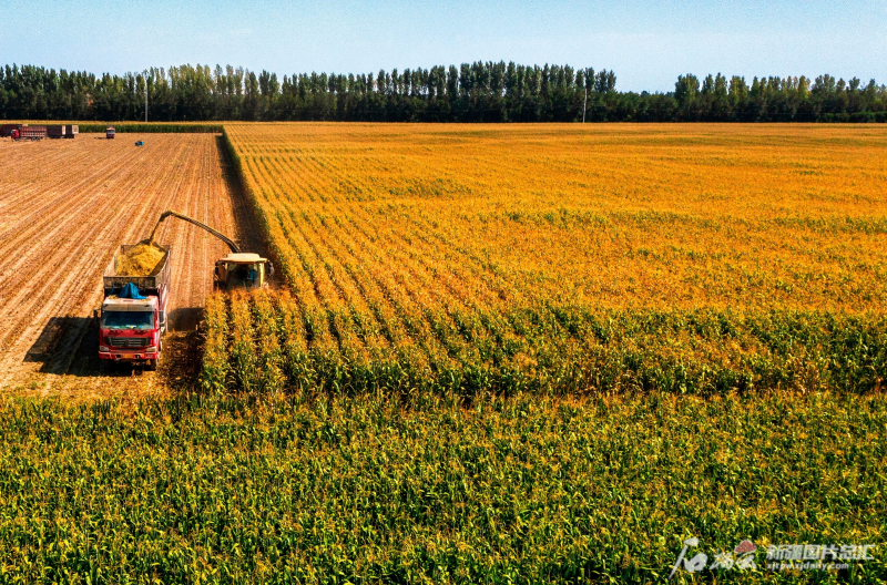 9月20日,克拉玛依国家现代农业示范区内,玉米收割机正在一片农田里作业。闵勇摄