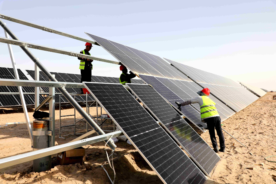 工人正在加紧施工安装光伏发电组件。林国强摄