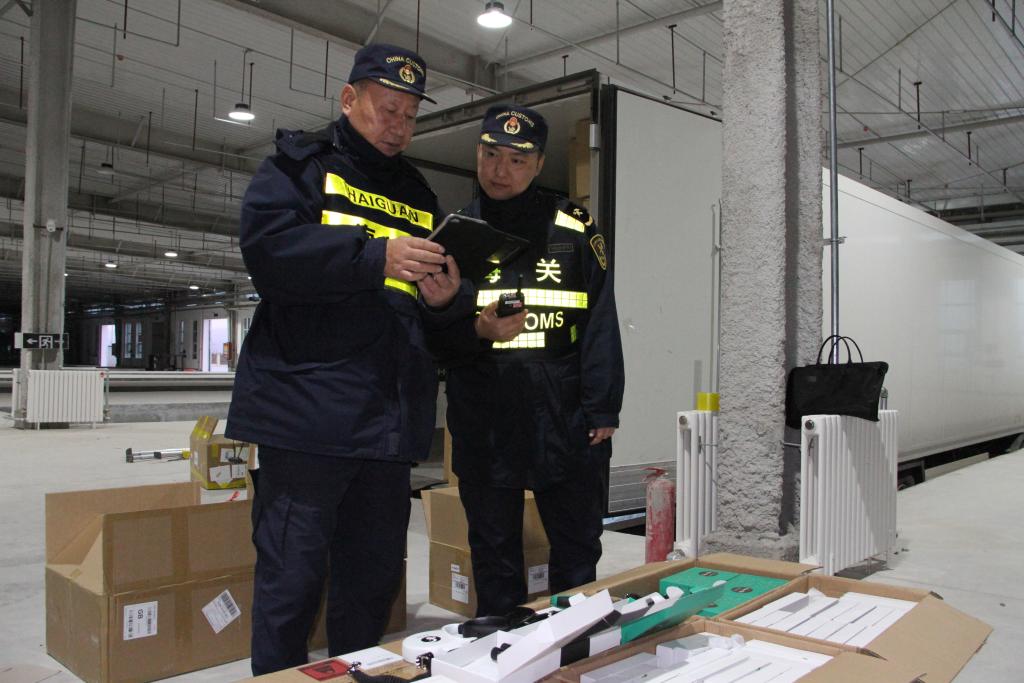 10月28日,阿拉山口海关关员巴特尔(左)和同事在查验货物。新华社记者刘红霞 摄