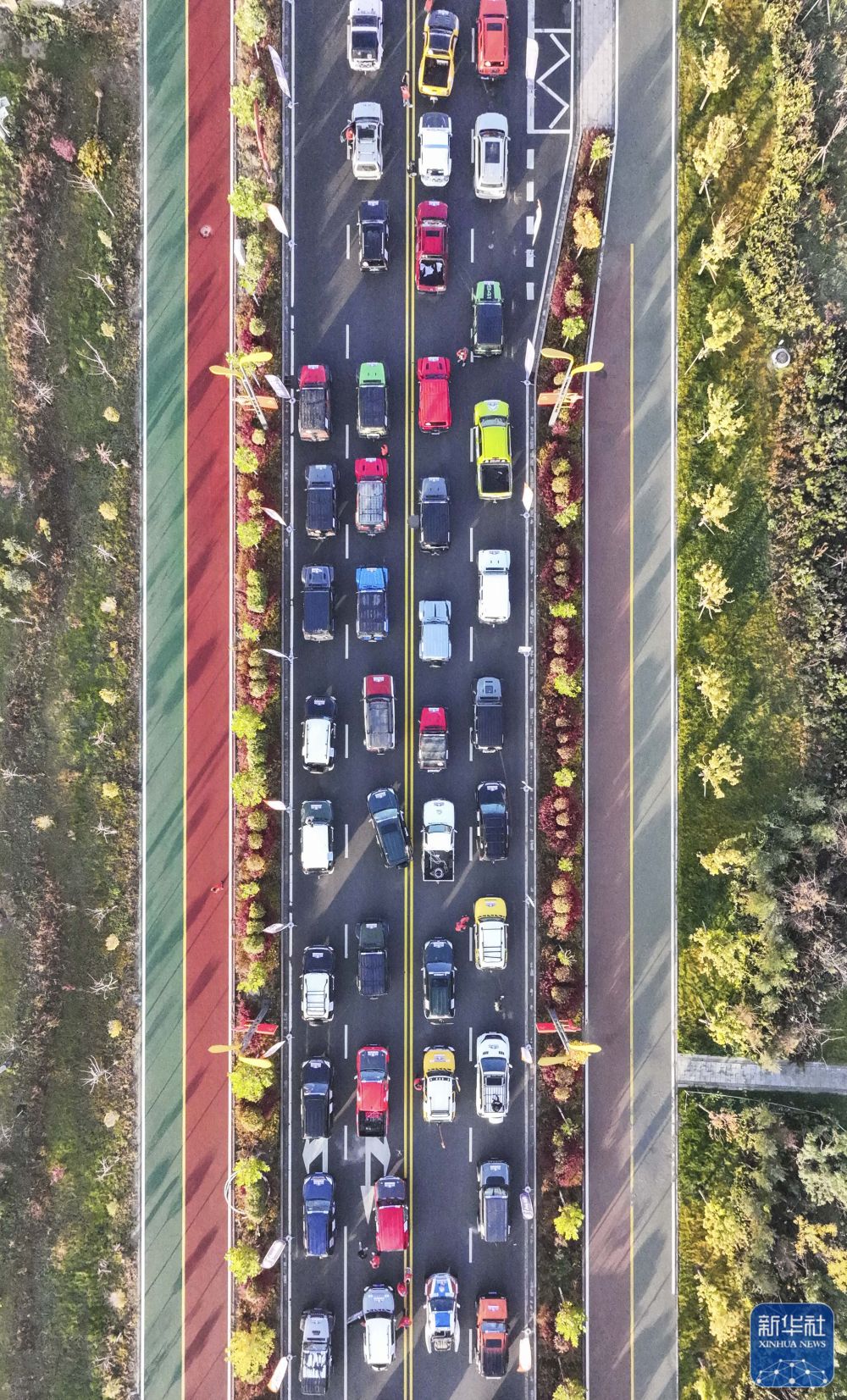 ↑车手在开幕式后驾驶赛车驶向位于新疆霍城县图开沙漠景区的比赛场地。胡虎虎 摄