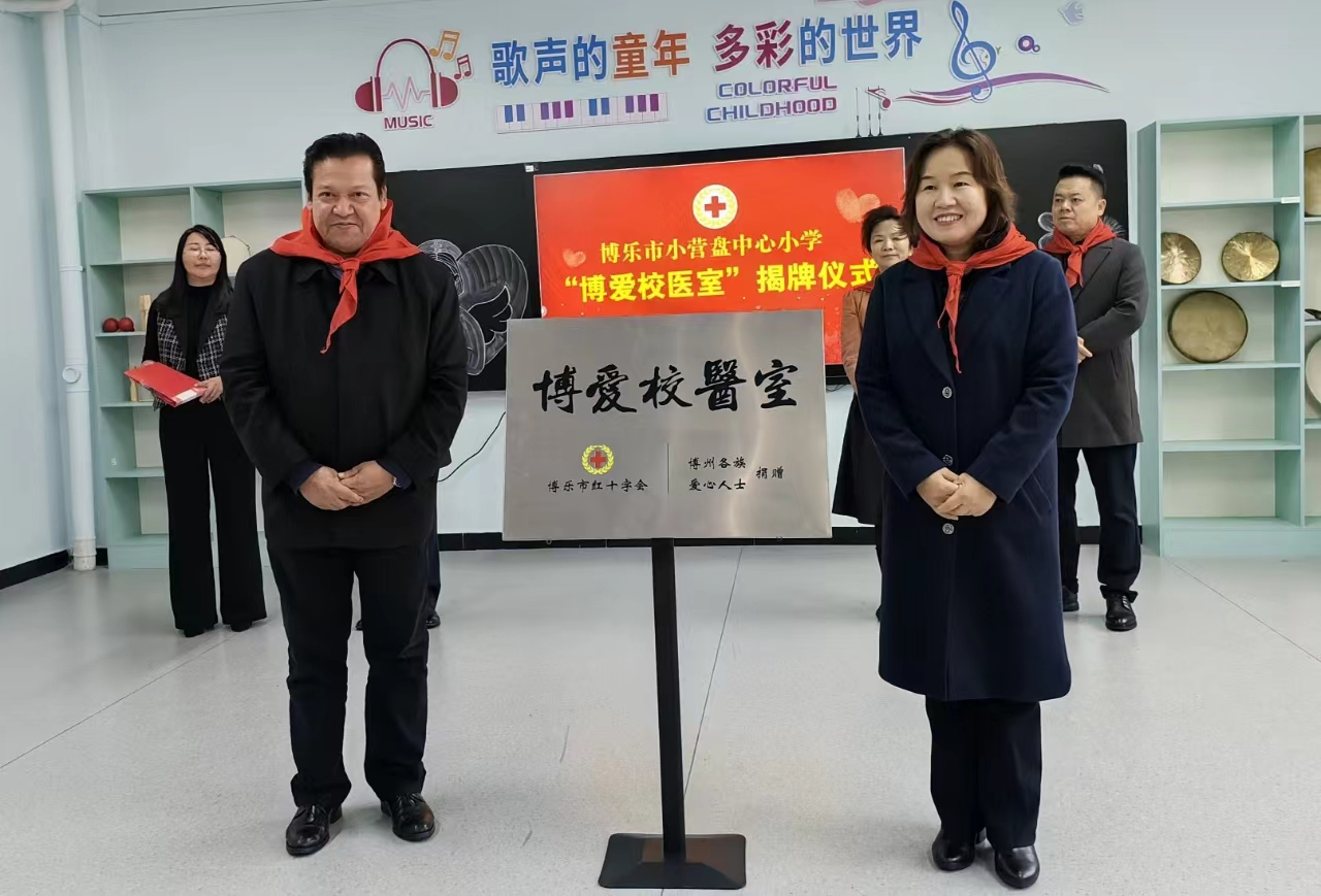 博尔塔拉蒙古自治州首个“博爱校医室”近日落户博乐市小营盘中心小学,新疆维吾尔自治区红十字会党组成员、监理会副监事长艾买提江·依达伊吐拉与自治州党委常委、副州长、红十字会会长阿尔特为“博爱校医室”揭牌。