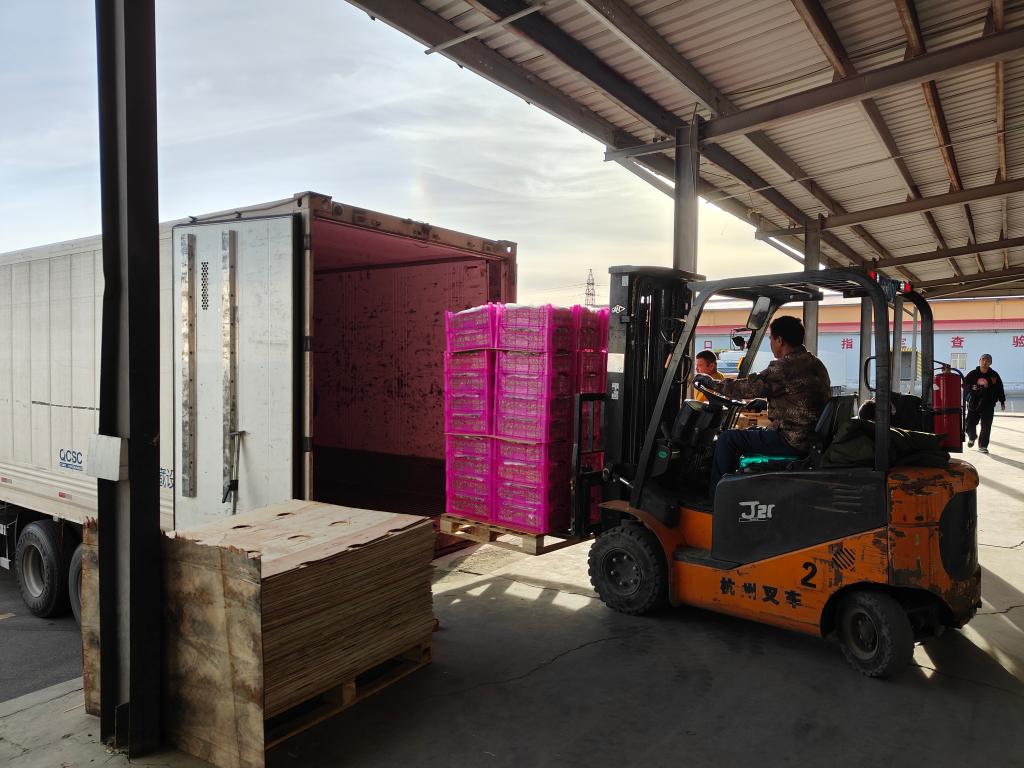 11月8日,塔城市利凯商贸有限公司厂区内,工人操作叉车搬运新鲜水果。新华社记者张瑜 摄