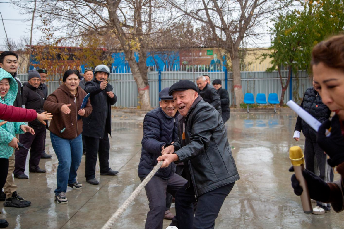11月13日,秋收后的北疆气温转凉,坐落在天山北麓的精河县大河沿子镇下着微微小雨,一场别开生面的“群众村晚”乡村运动会正热闹开场,农牧民们火热的激情点燃了阴沉的雨天。