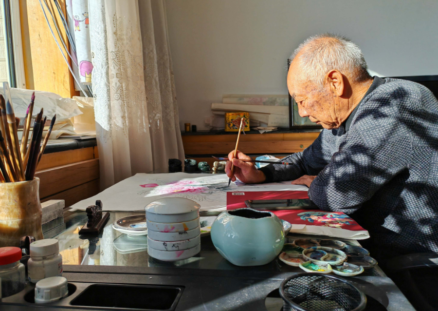 83岁的石太恒坐在窗前的画案旁画画,几笔勾勒,几笔晕染,一朵饱满富贵的国画牡丹便悄然绽放。