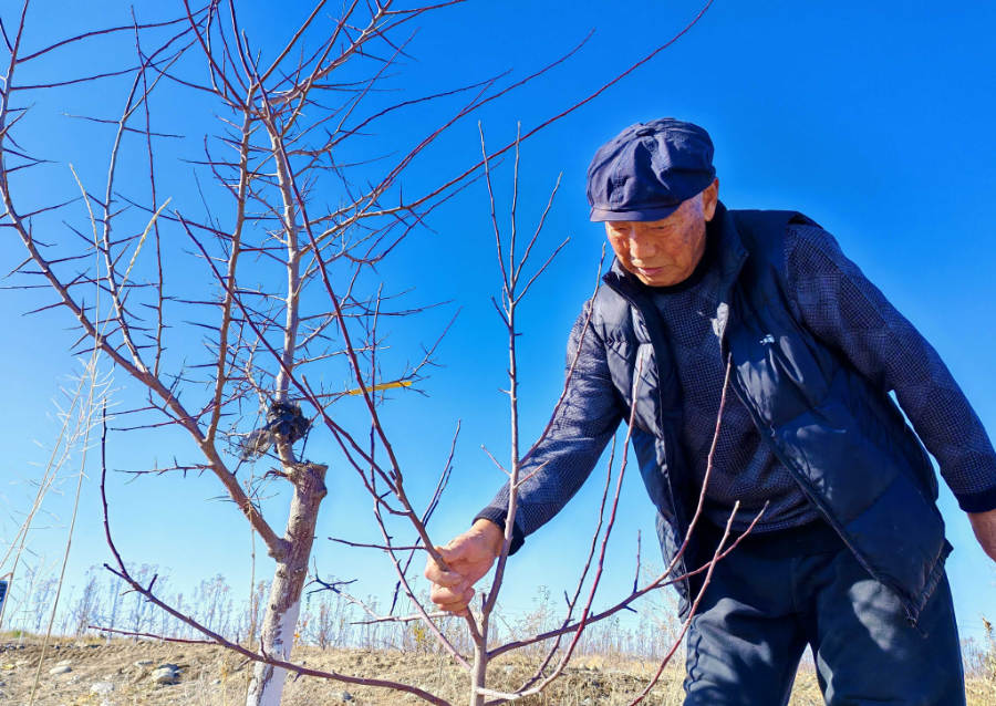 石太恒正在查看果树越冬情况