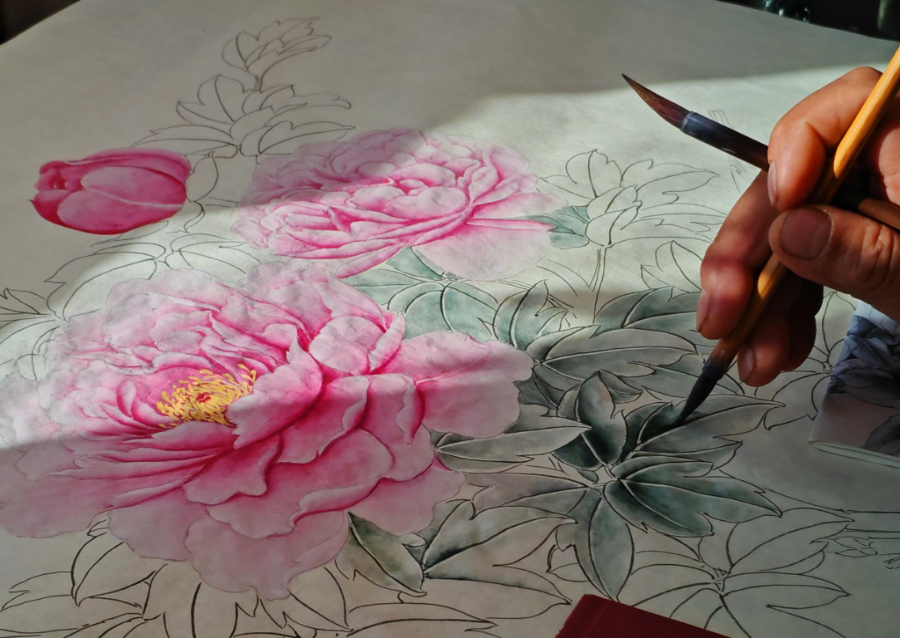 蘸水、调墨、着色……石老先生一手同持两支笔,一浓一淡,笔尖游走,勾勒涂抹间,一朵牡丹花便在纸上绽放开来。花头富贵、叶子洒脱,画卷疏密有致、神韵兼备。