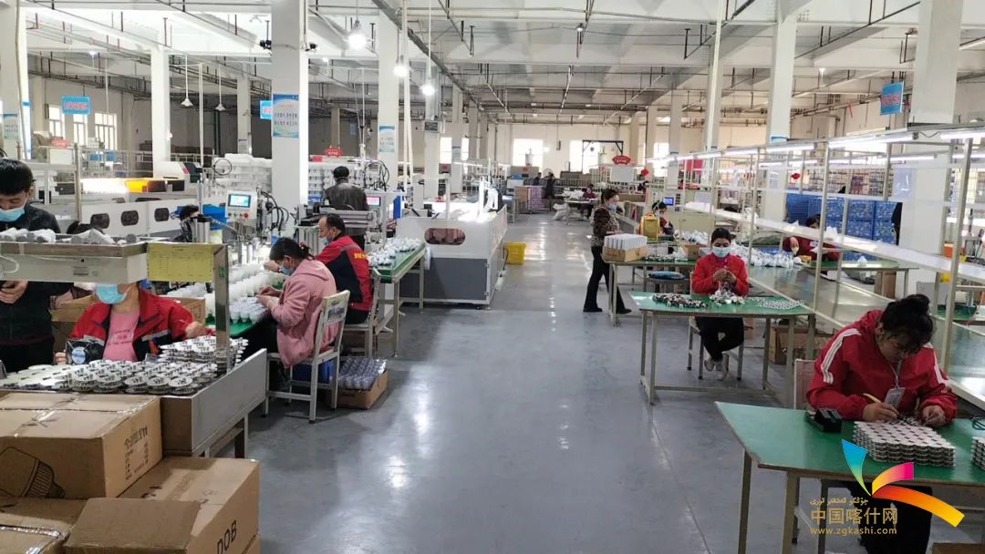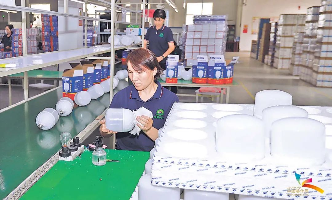 疏勒县喀什丝路照明科技有限公司车间生产线上,工人们在有序完成灯具组装工序。