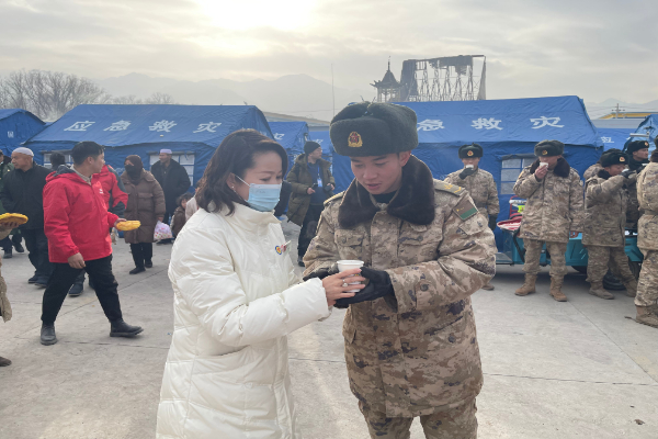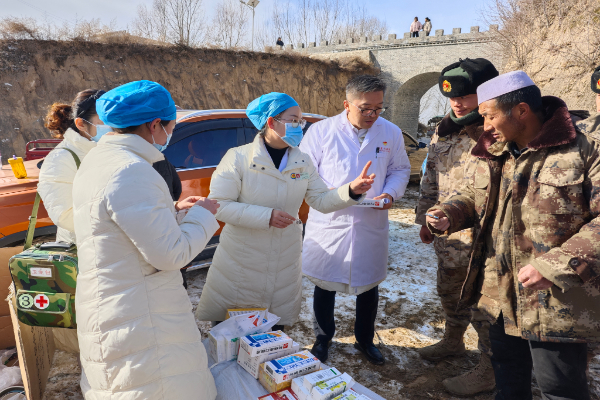 医疗队奔赴临夏州积石山县大河家镇,为地震灾区群众和救灾官兵提供服务,赠送药品和驱寒姜汤。