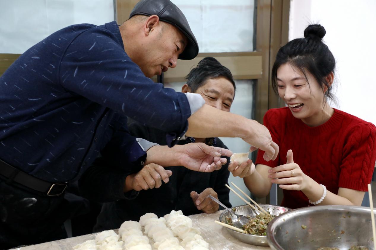 在大家帮助下,李爽正在学包饺子。王芳芳 摄