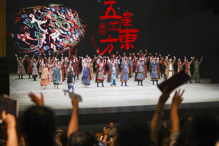 2023年7月31日,和田地区新玉歌舞团在乌鲁木齐京剧院演出舞剧《五星出东方》后和观众互相挥手致意。这场演出是第六届中国新疆国际民族舞蹈节的参演剧目之一,曾荣获国家“文华奖”等。新华社记者 郝昭 摄