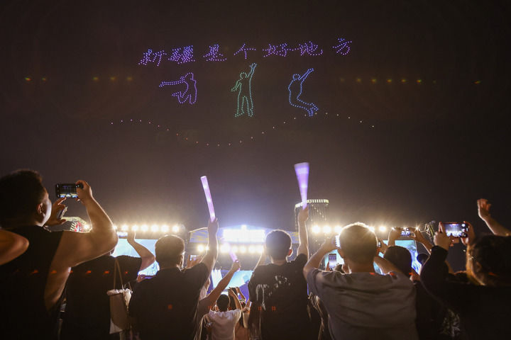 2023年7月8日,乐迷在疆菓音乐节上观看演出及无人机表演。