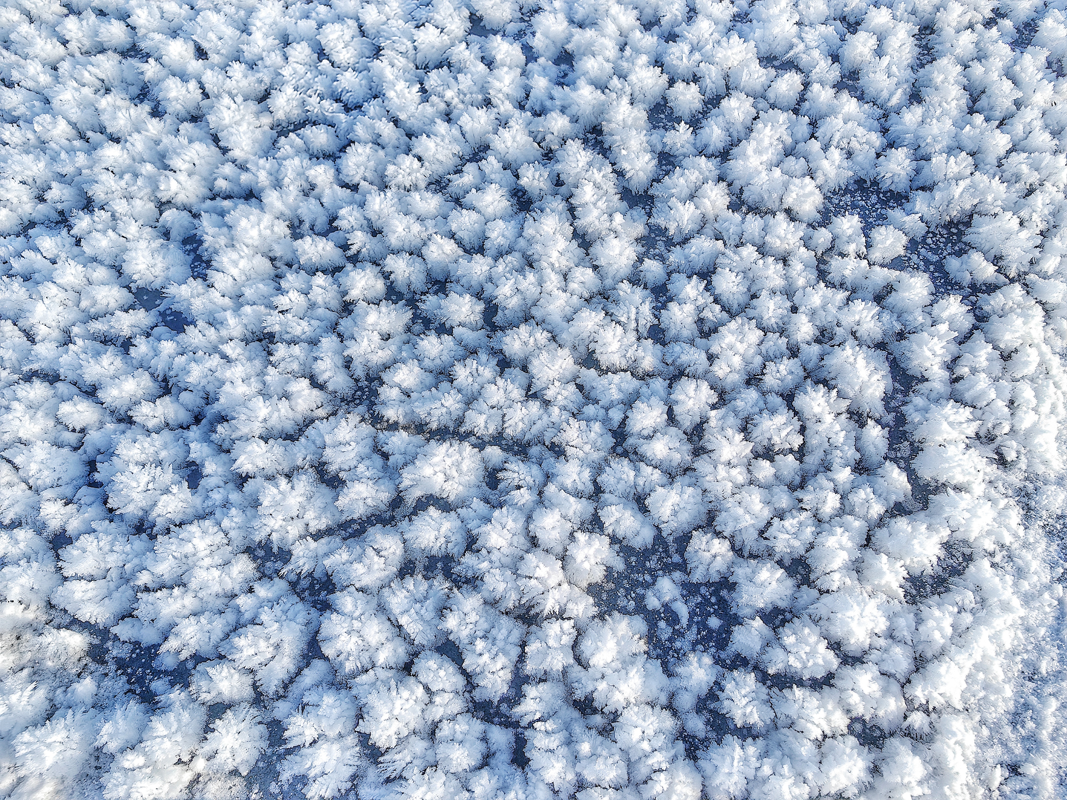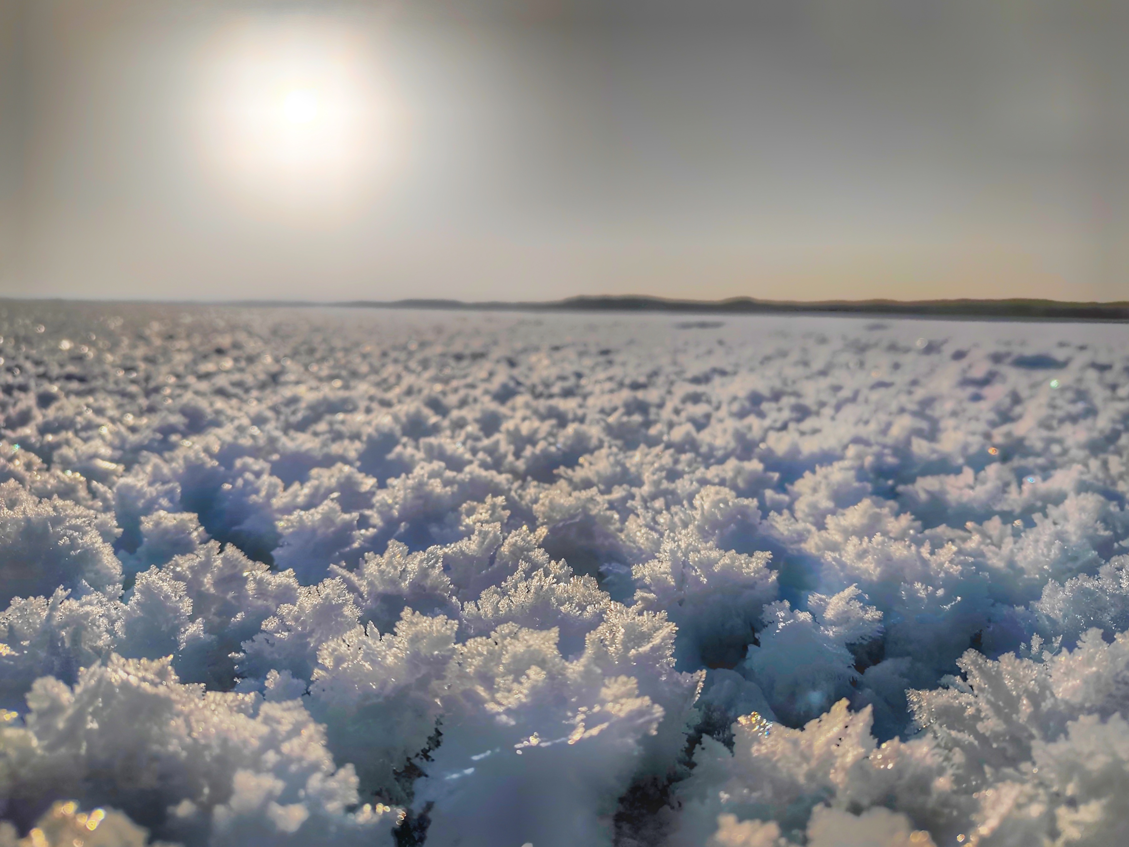 小寒时节,新疆内陆淡水湖博斯腾湖,因为气温低寒,湖面上布满冰清玉洁的白霜花朵,放眼望去,无数洁白晶莹的冰花“镶嵌”在湖面、岸边。