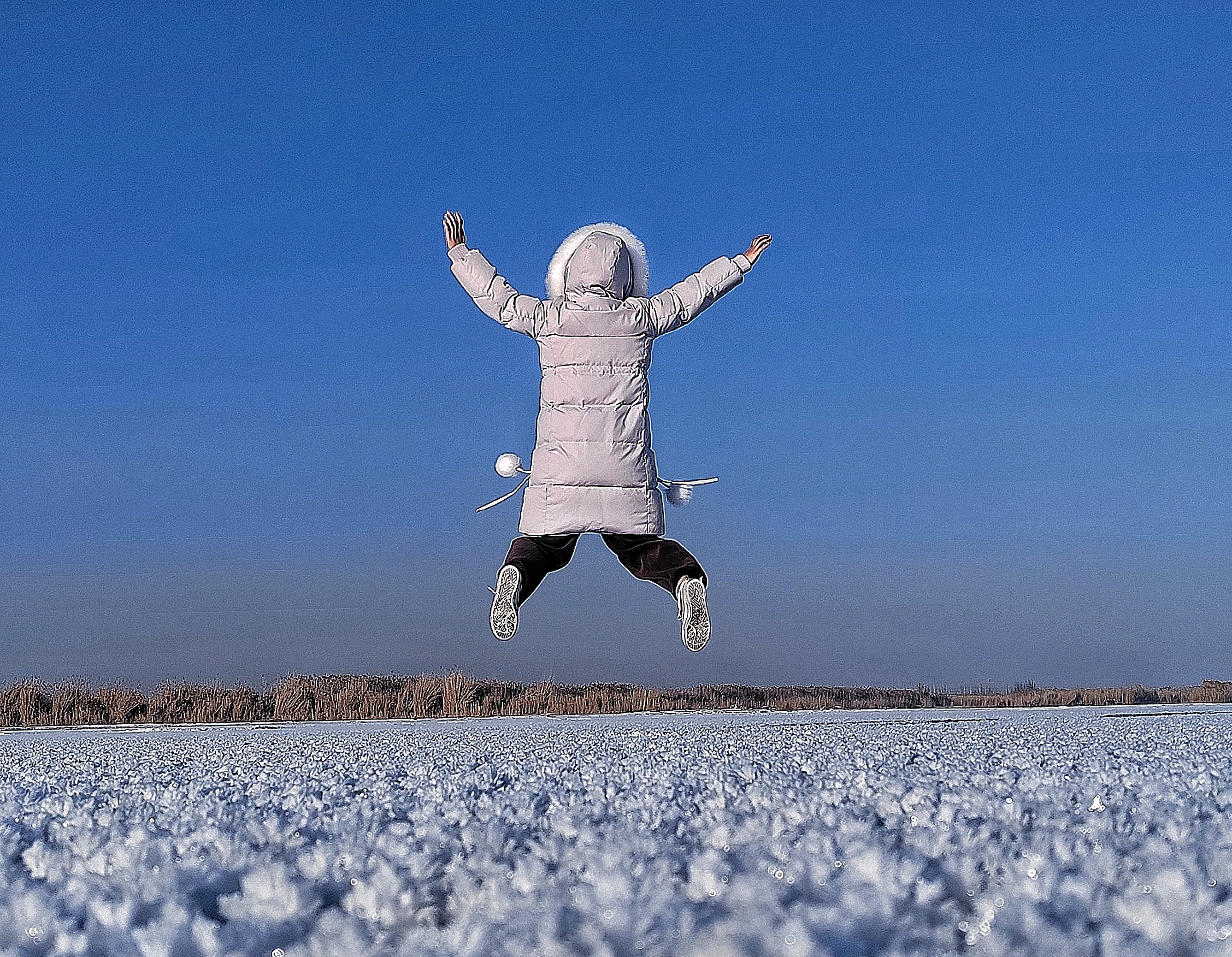 小姑娘在博斯腾湖冰花上跳跃。王陆斌摄