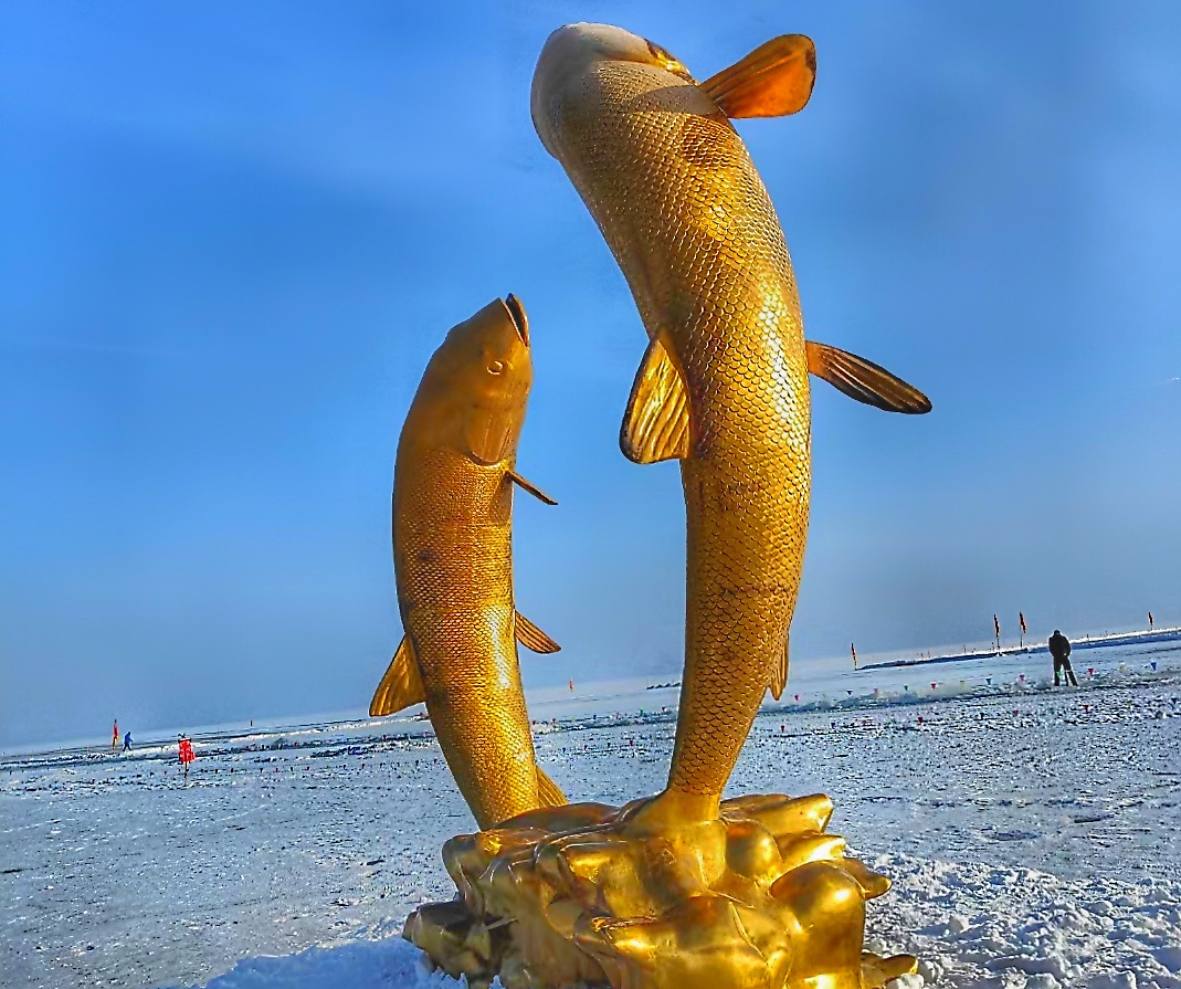 具有博斯腾湖特产的“草鱼雕像”树立在洁白的冰面上。王陆斌摄