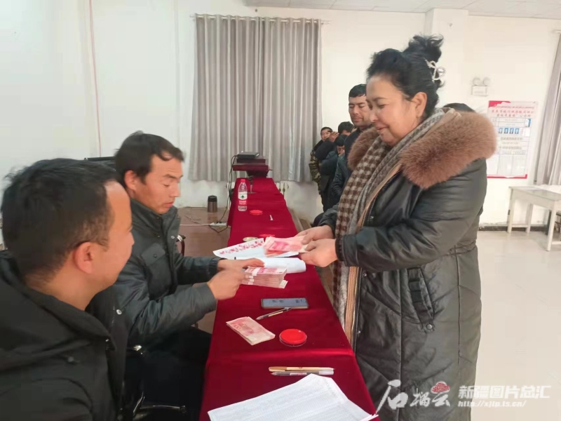 1月9日,库车市墩阔坦镇光明村举行的村集体经济群众分红大会上,村民在领分红。柴扩摄