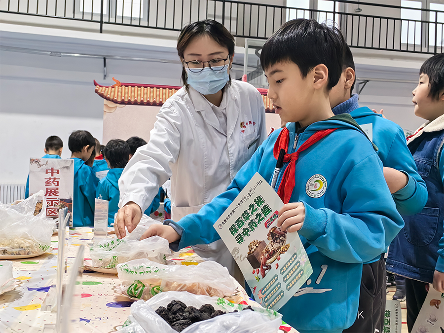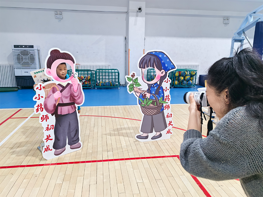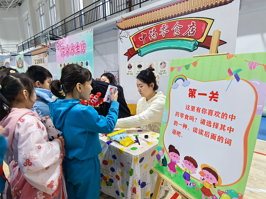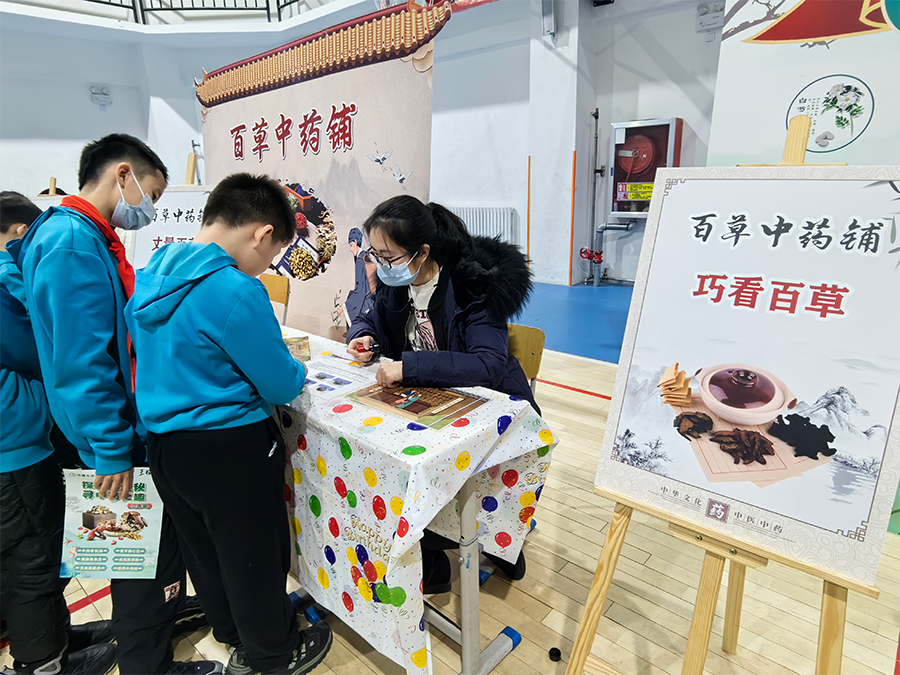 现场设有中药零食店、走进百草园、花朵养生店、百草中药铺、艾灸熏熏店等5个闯关环节,将本学期的学习内容分模块融入其中。比如“中药零食店”是语文学科的识字能力测试,学生正确朗读出零食上的中药名称便可闯关成功;“走进百草园”是数学学科的能力测试,学生通过对中药进行物体观察,说出物品的长度、单位等。