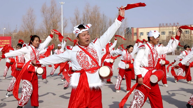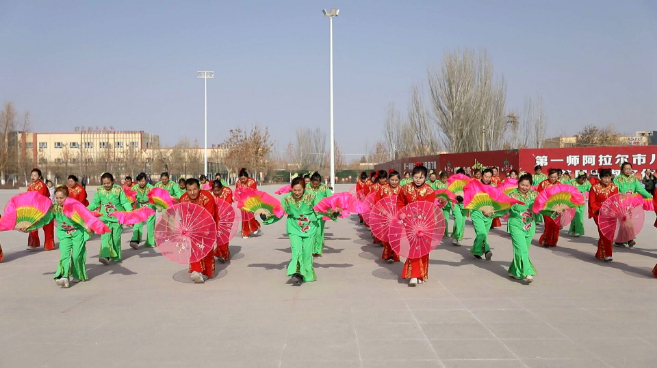 与此同时,第一师阿拉尔市各团镇社火表演节目也在抢抓时间排练,在八团塔门镇排练现场,近120名演职人员克服时间紧、天气寒冷等困难,加紧排练选送的安塞腰鼓、陕北秧歌等社火展演节目。