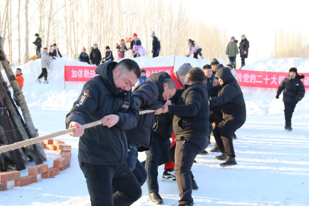 除了歌舞表演,还有精心准备的游戏、文体比赛、美食、热饮和纪念品,在现场气氛的带动下,许多村民和小朋友走上台前,积极地参与到了雪地拔河、雪地押加等比赛当中。