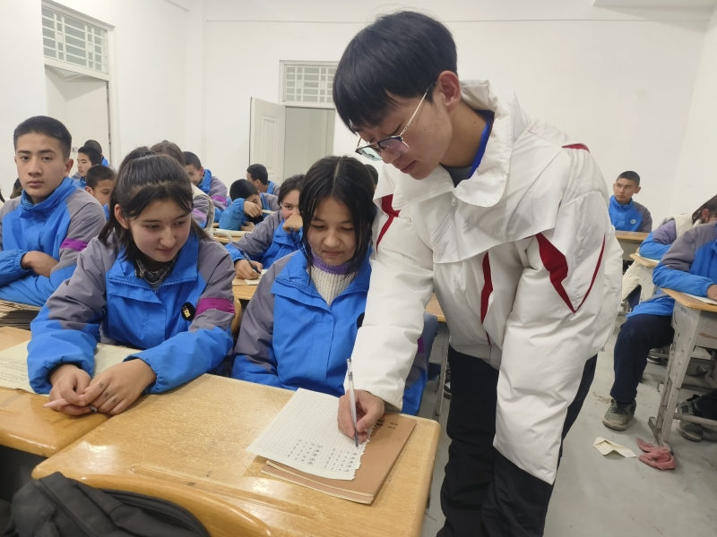 课堂上宋腾傲会走到每一位学生身边,耐心纠正学生的一笔一画。下课后,学生团团围住宋腾傲,好奇地问东问西,“大学校园是什么样的?”“坐飞机来新疆都能看啥美景?”……宋腾傲觉得这是做老师最幸福的时刻。